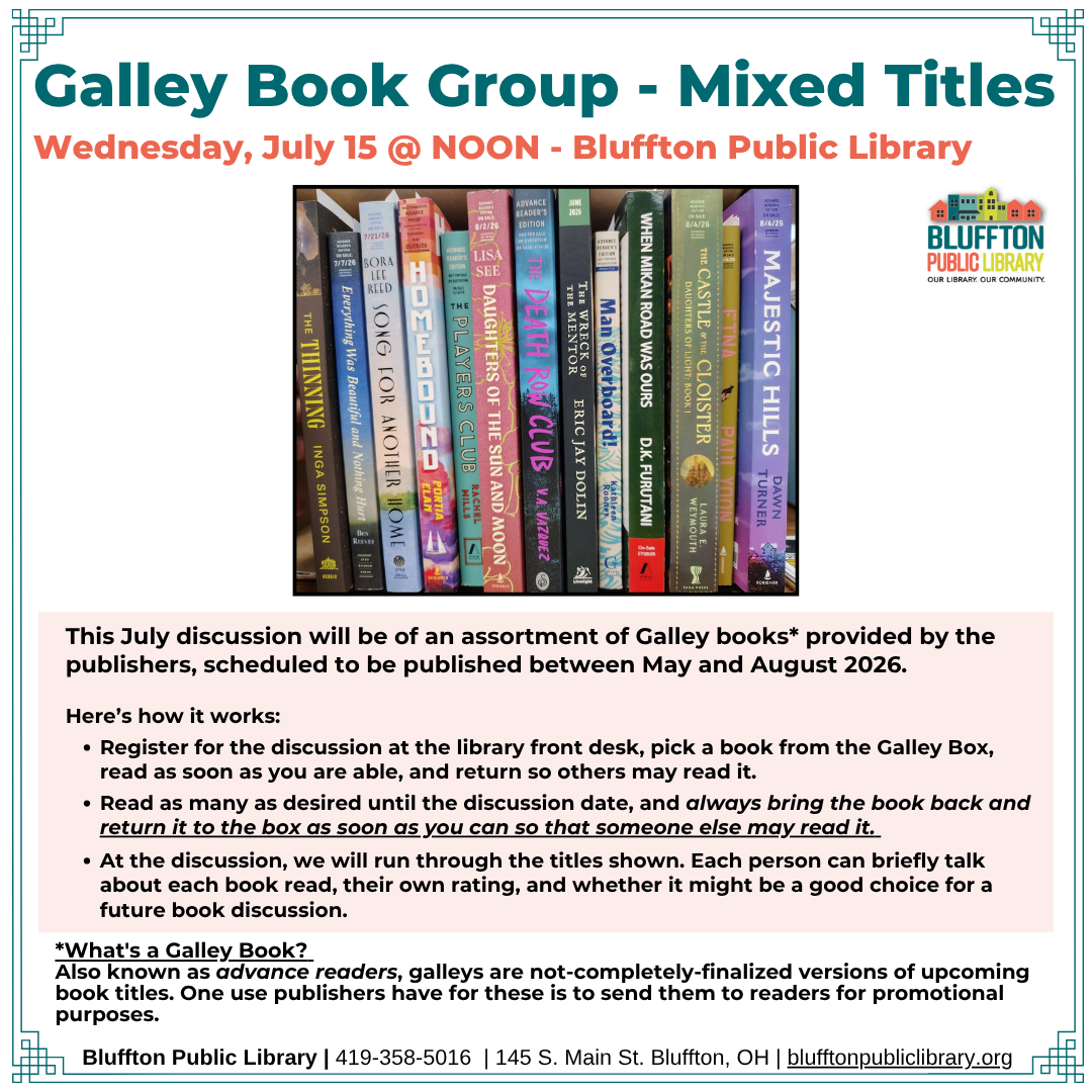 Galley Book Group - Mixed Titles (R) will meet on Thu., July 15 at NOON. This discussion will be of an assortment of Galley books provided by the publishers, scheduled to be published between May and August 2026.